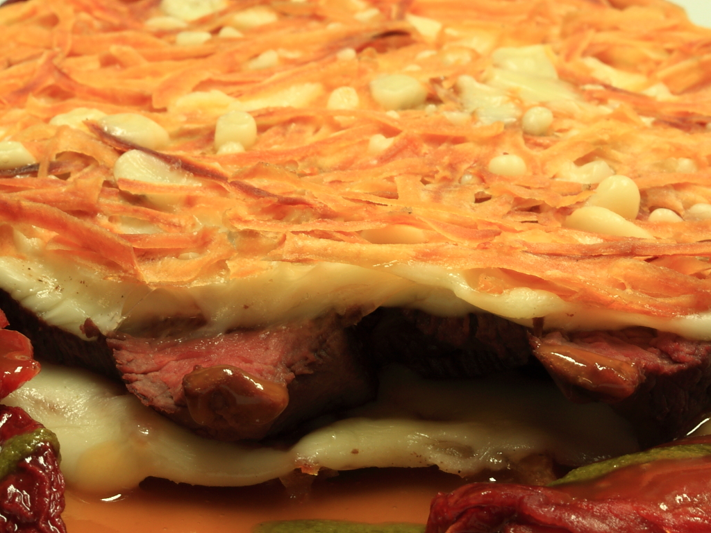 Rösti di patate croccante con bocconcini di filetto di manzo, formaggio Asiago, pomodori parzialmente disidratati, pepe e fondo bruno