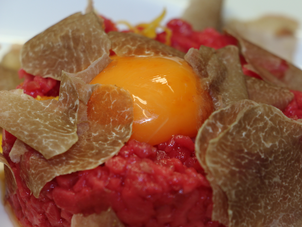 Doppio filetto di bovino (+500 g), frollato sul roast beef per almeno quattro settimane, cotto intero, poi tagliato, servito con il fondo di carne all'Amarone, tortino di patate e spinacetti saltati.