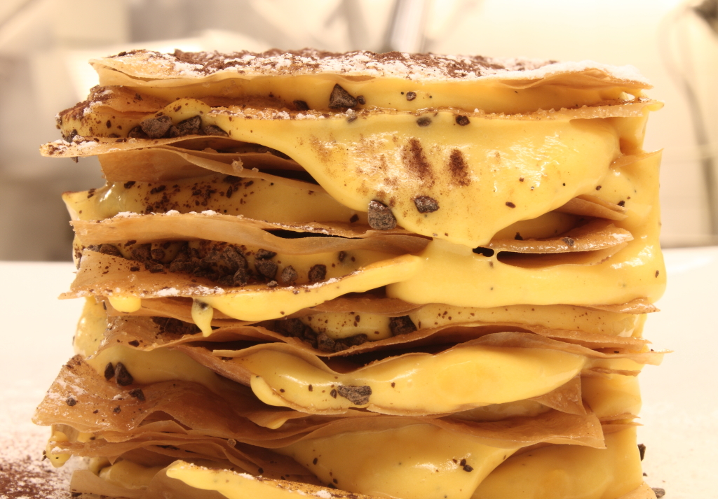 Millefoglie alla crema pasticcera con scaglie di cioccolato fondente