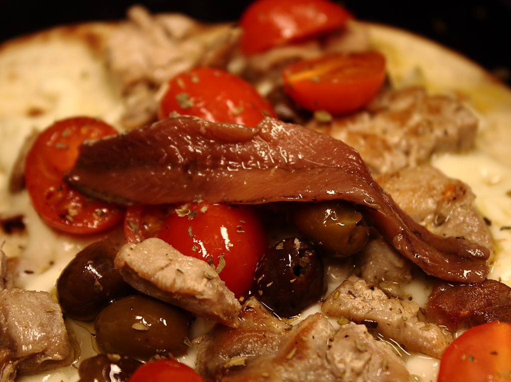 Involtino di sfoglia sfarinata con mozzarella, cubetti di tonno appena scottati, olive nere e verdi, acciughette, pomodorini, lattuga, origano fresco e salsa rosa