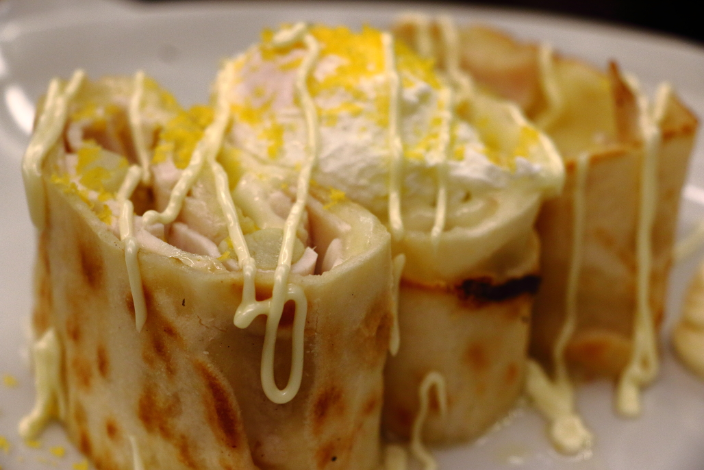Le classiche crêpe, senza glutine, ripiene di cioccolato al latte, fondente e biondo servite con crema alla vaniglia e panna montata
