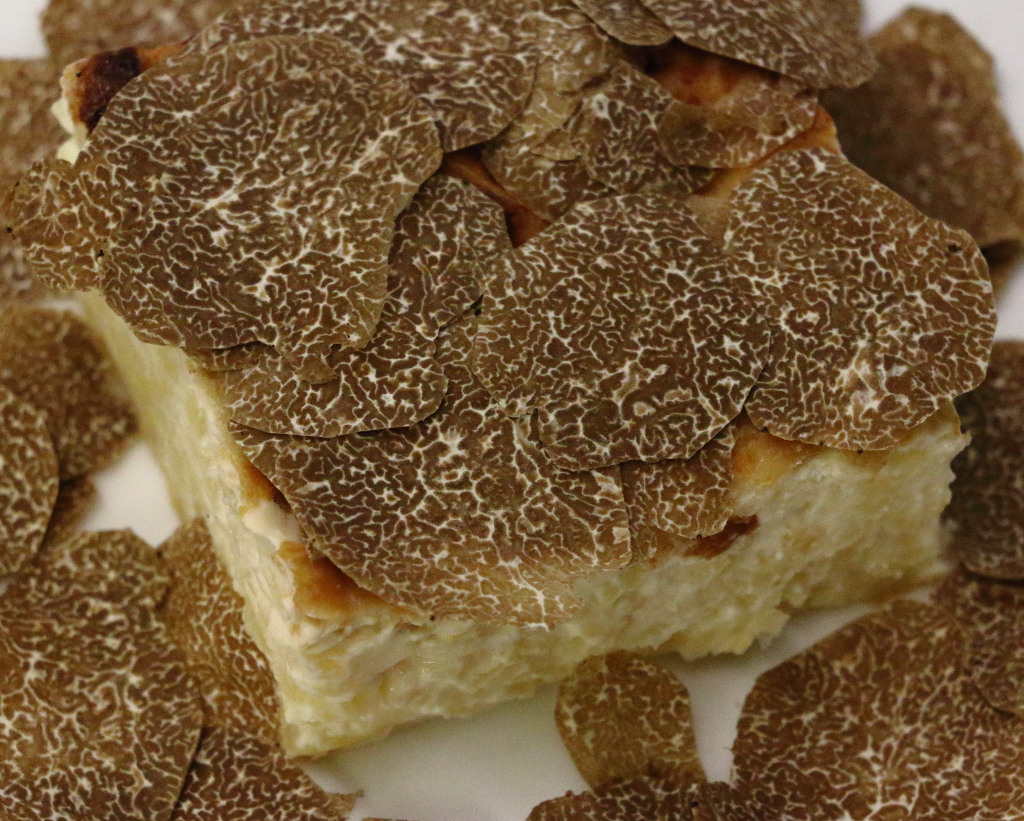Tortino di crema di latte e patate servito con tartufo nero pregiato