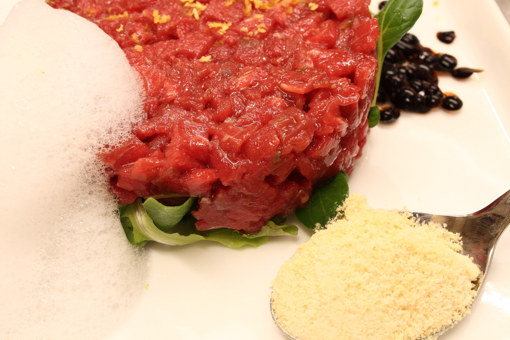 Tartara di carne di manzo cruda accompagnata con wasabi, aceto balsamico e polvere gelata di senape