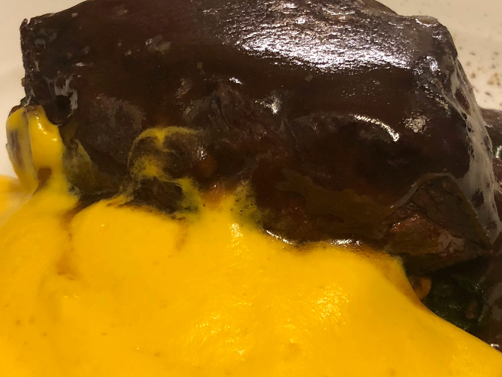 Carne di manzo (tasto-biancostato dalla parte della costata), ispirandosi alla maniera argentina, cotta e affumicata lentamente con legno di cirmolo e servita con tortino, spuma di patate e salsa barbeque