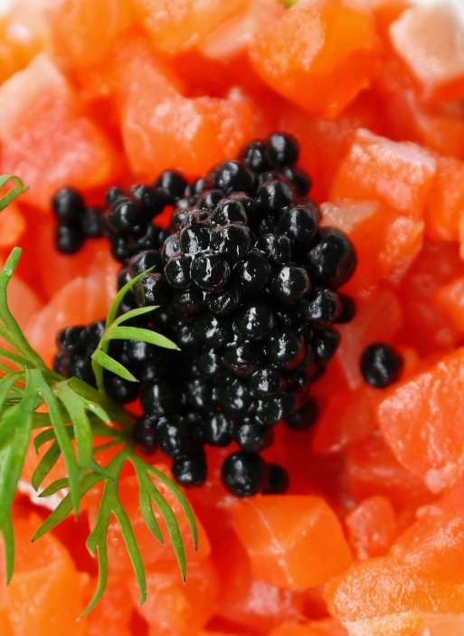 Tartare di salmone crudo e caviale di storione russo, 10 g. nella versione piccola e 5 g. nell'assaggio, servita con panna acida a parte
