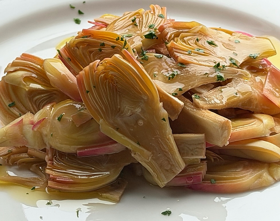 Insalatina di castraure crude con scaglie di parmigiano riserva vacche rosse, condite con olio, prezzemolo e succo di limone